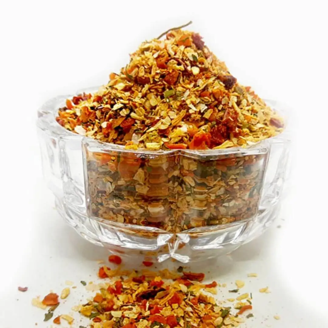 Ingredientes: açafrão, alho granulado, cebola granulada desidratada, salsa, cebolinha verde, cenoura, caldo de costela, pimentão vermelho e pimentão verde granulado.